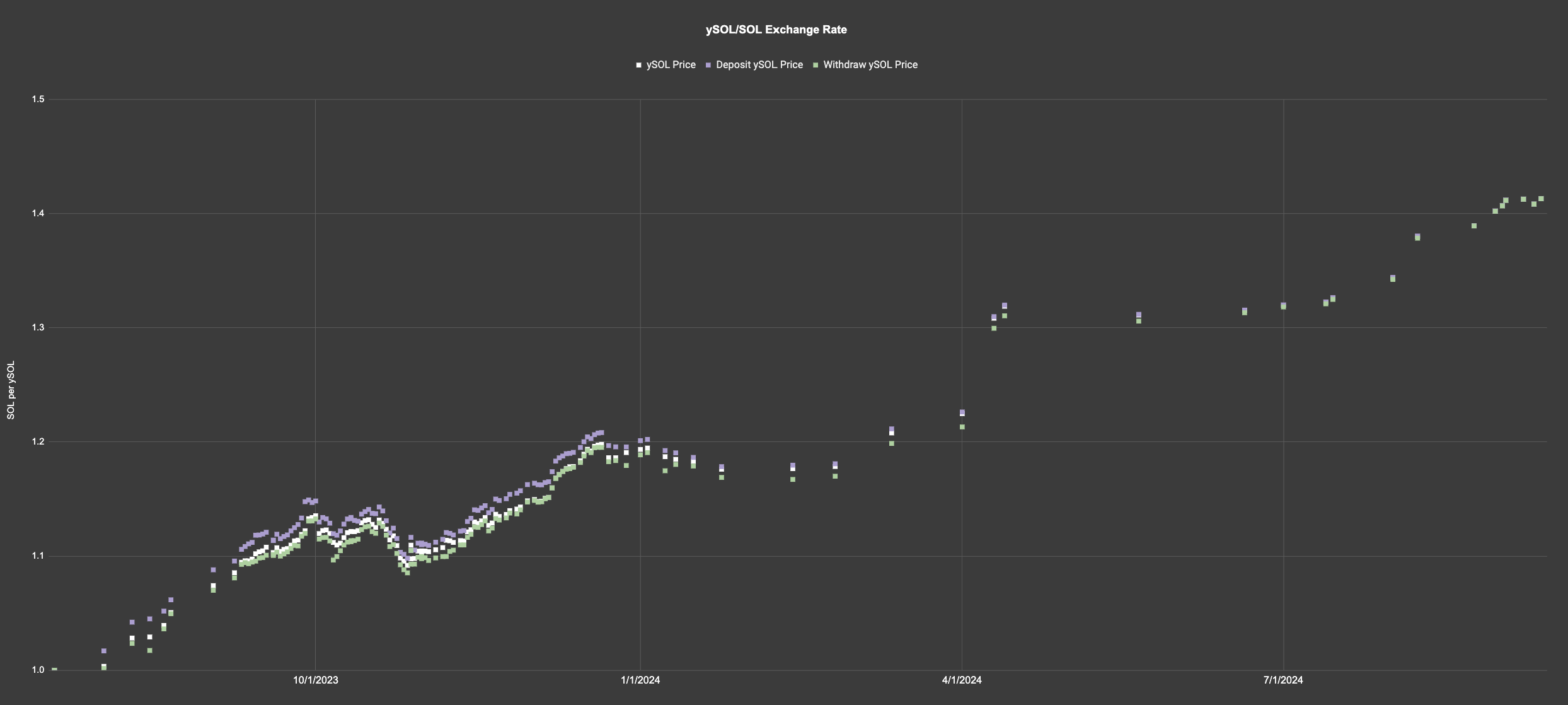 <figure><img src="https://1674869739-files.gitbook.io/~/files/v0/b/gitbook-x-prod.appspot.com/o/spaces%2FdRFaAQj48kjoF2MVHWg3%2Fuploads%2Fgit-blob-811fd19a2106b588d1adc5ef6fc82b4c05c0f9f2%2FySOL_Annual_Performance.png?alt=media" alt=""><figcaption><p>ySOL/SOL Exchange rate</p></figcaption></figure>